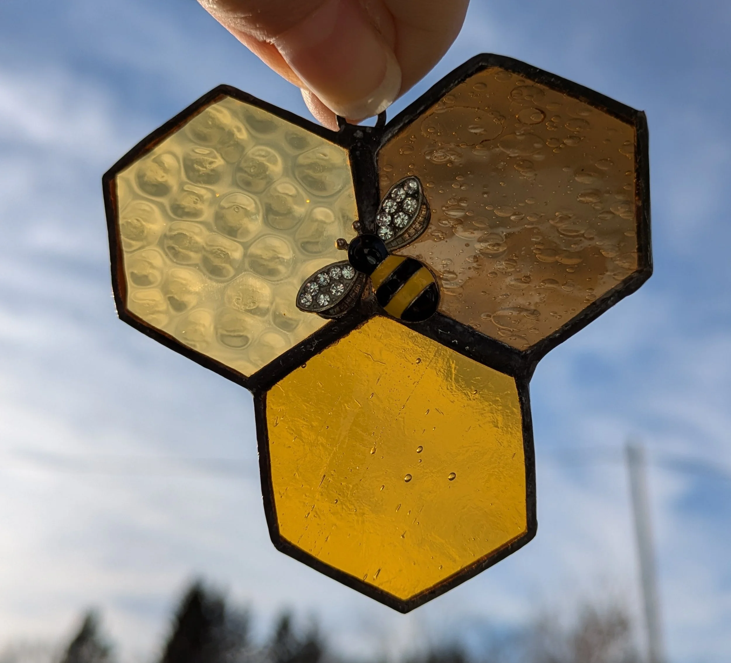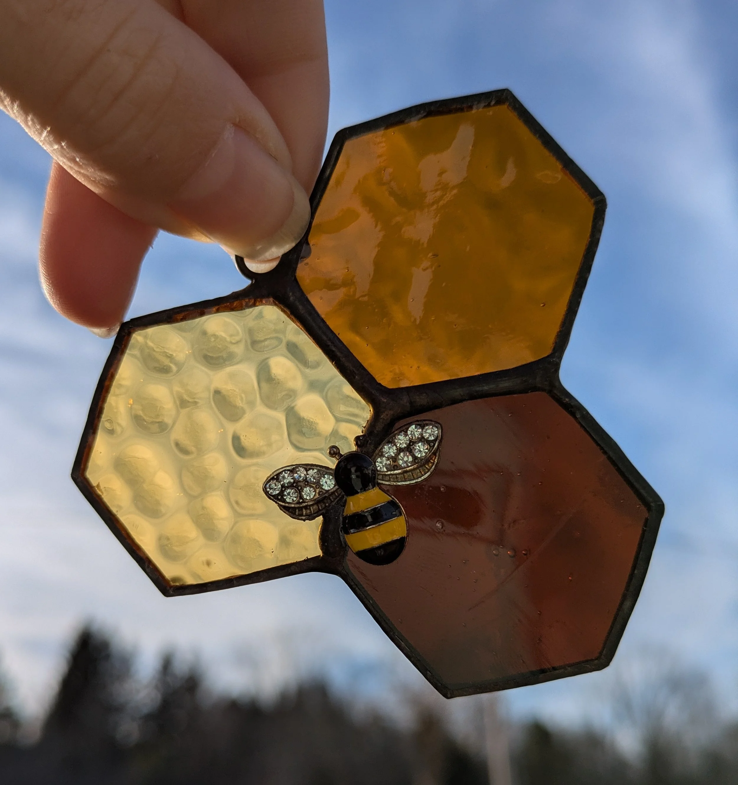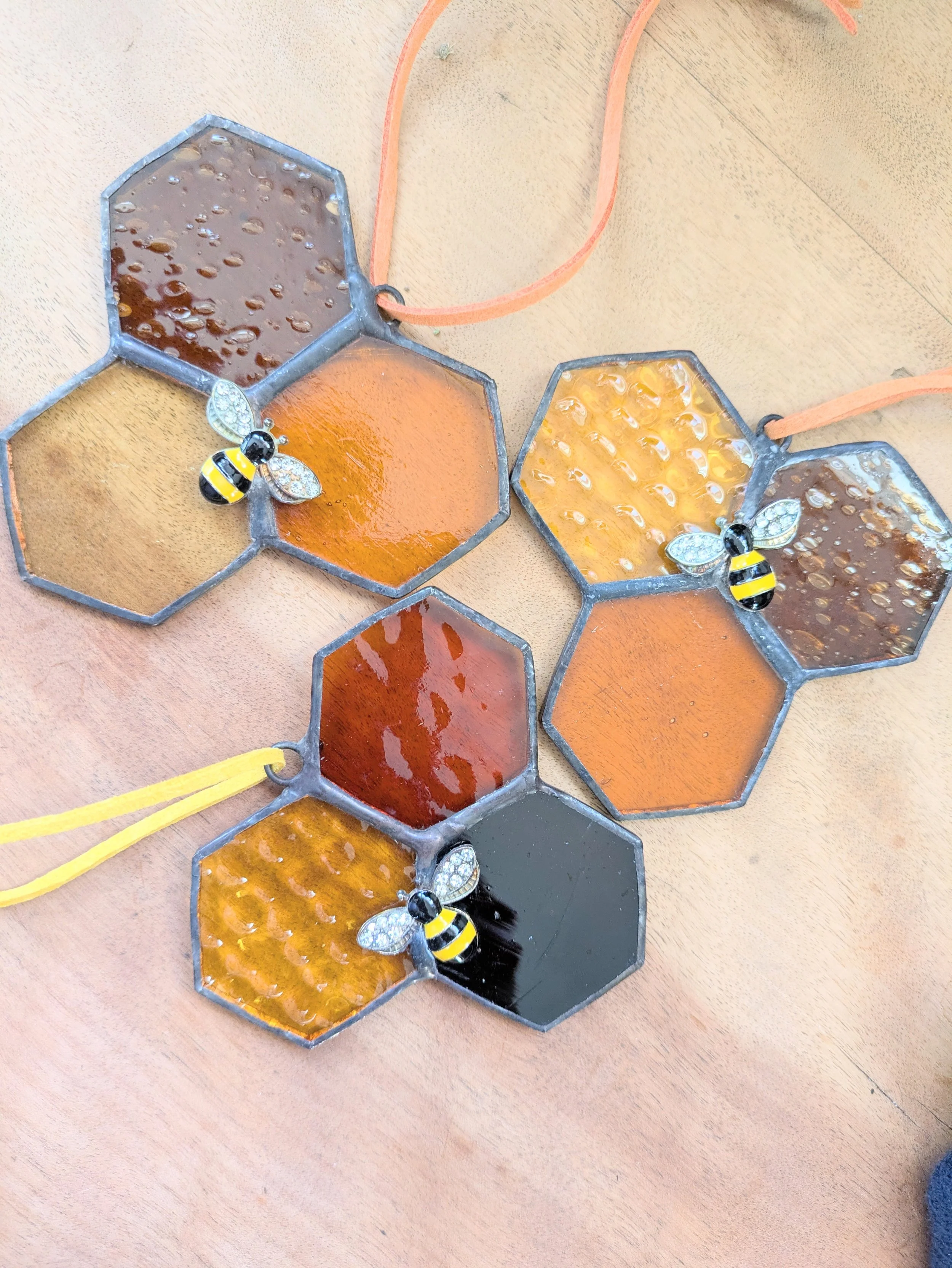 Shop › Honey Image 1 of 3 Image 2 of 3 Image 3 of 3 Honey $22.00 These classic hive fragments feature repurposed glass from decommissioned Church windows and a little honey bee. Quantity: Add To Cart Added! These classic hive fragments feature repurposed glass from decommissioned Church windows and a little honey bee.