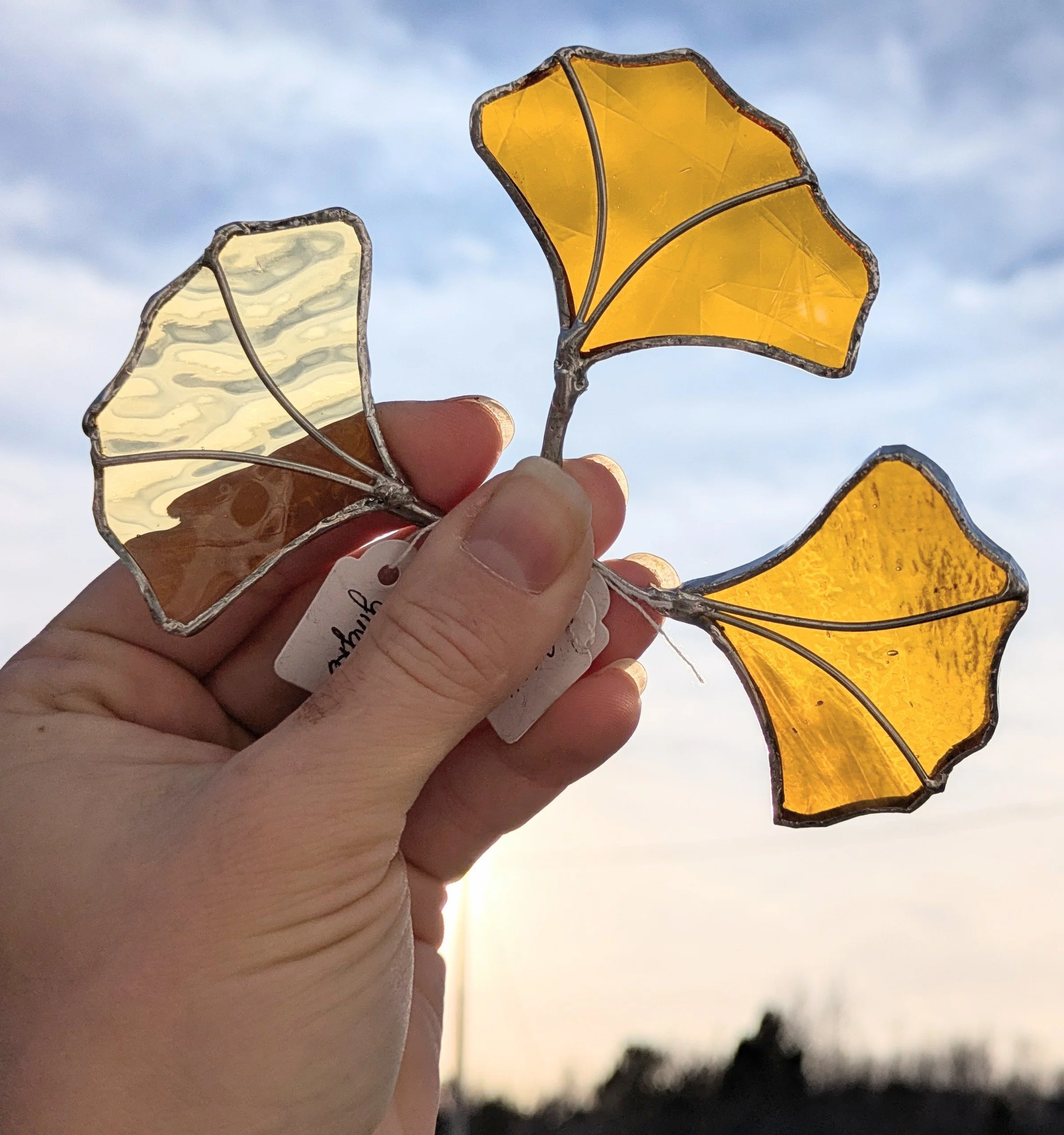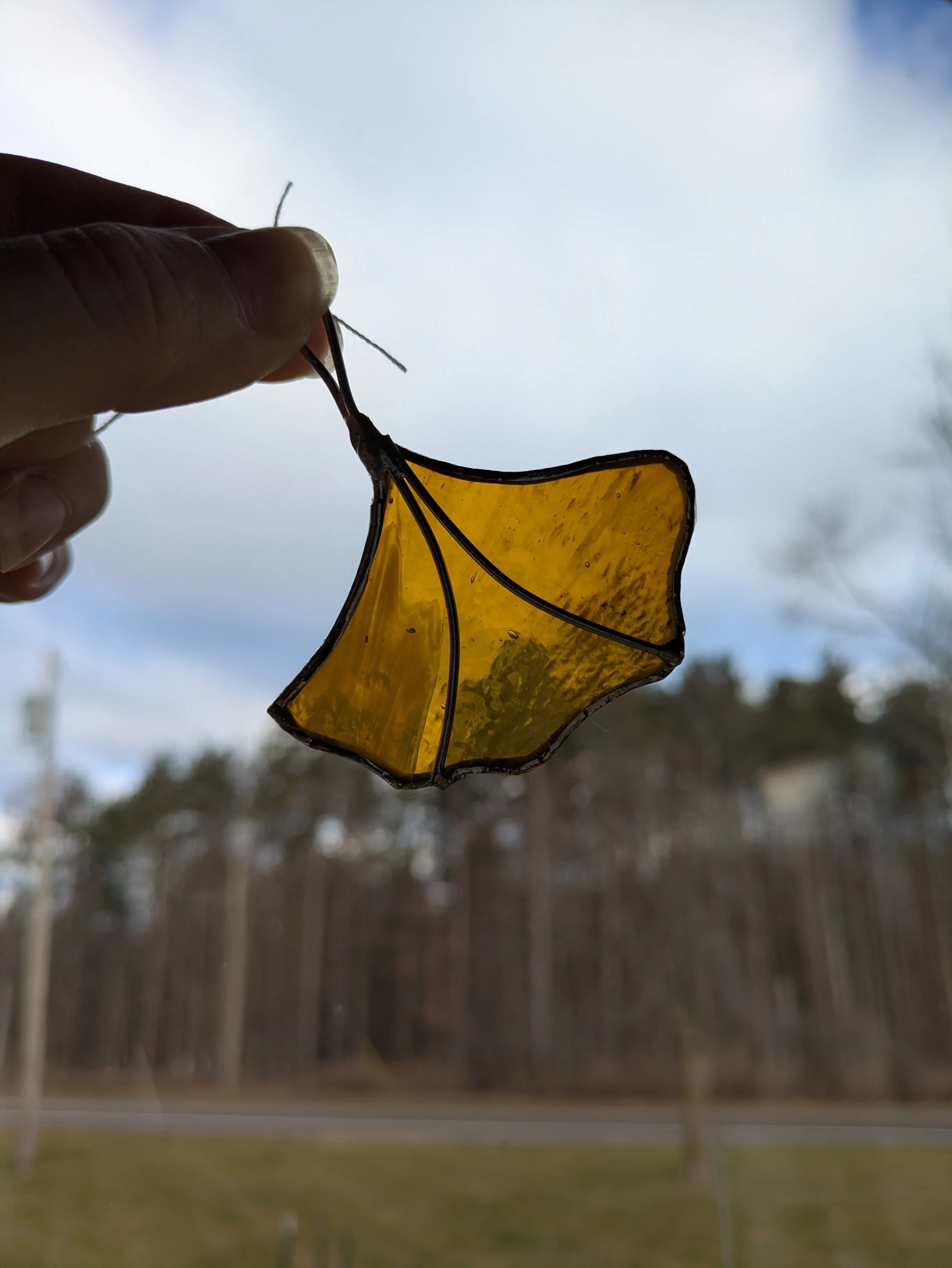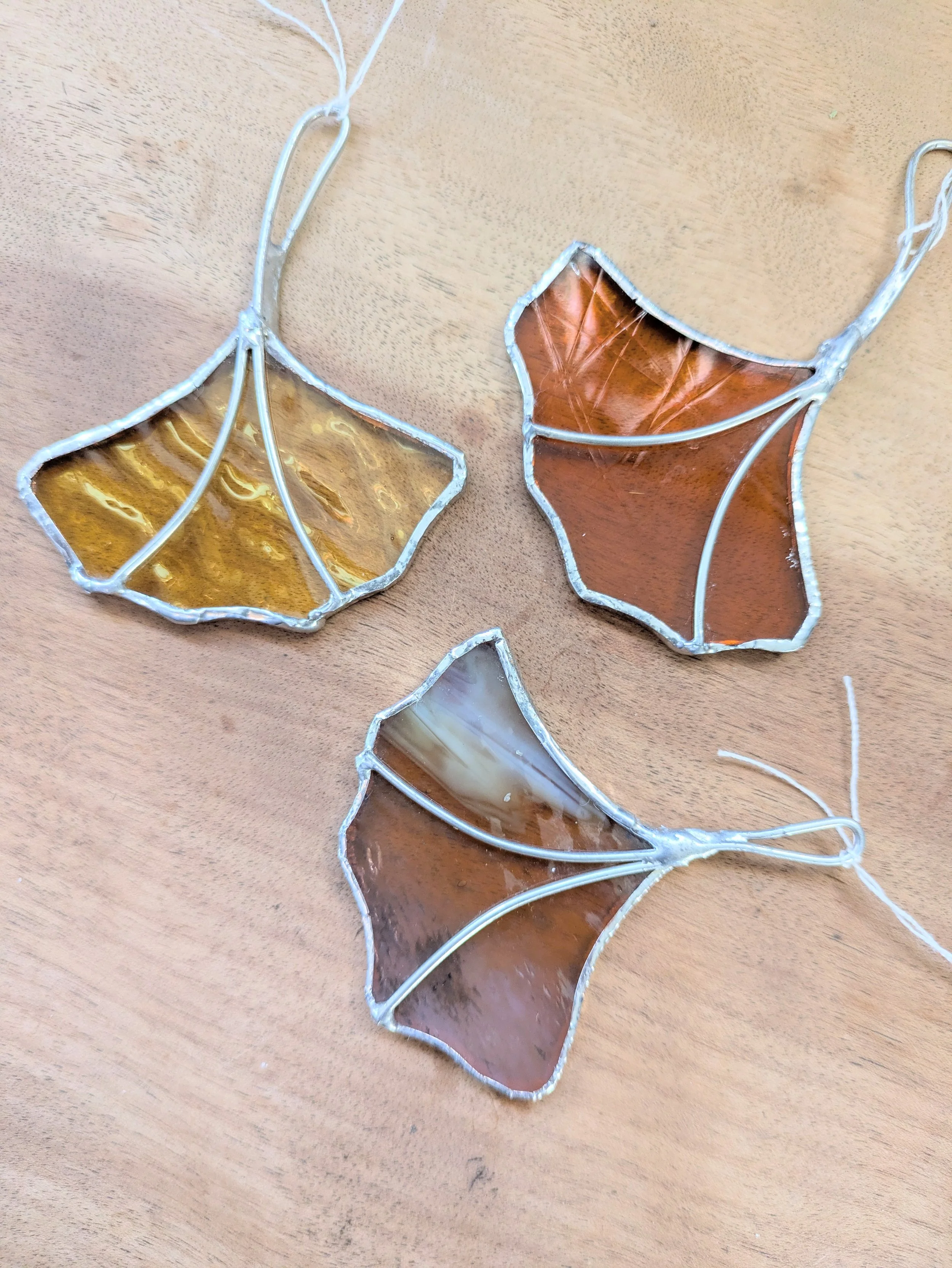 These gingko leaves are made from scrap glass in a variation of amber glass colors and textures. Each leaf has one piece of glass with wire. They can be used to decorate a window or as an ornament.
