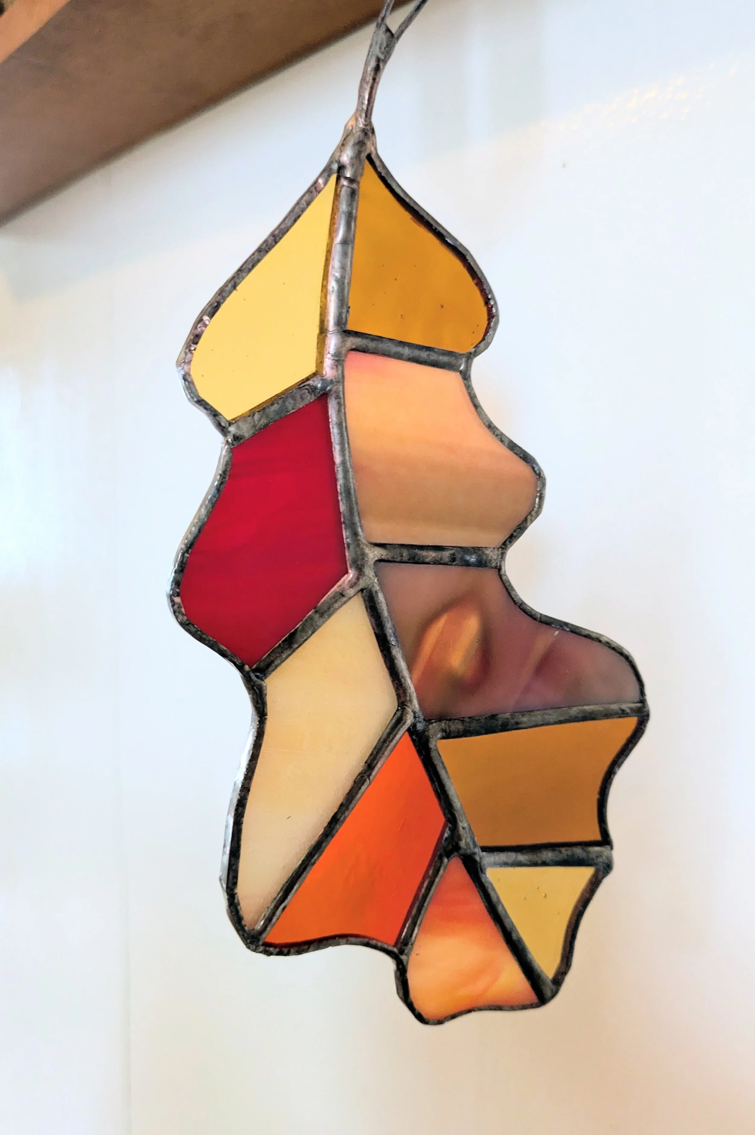 This Fall oak Leaf is made from mostly repurposed scrap glass in an array of orange, red, and amber colored glass. Measures 7.5”x3.5”